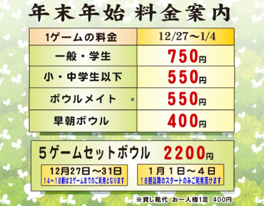 ※日曜日・祝日の14~18時の時間帯は、3ゲームまでのご利用となります。 ※年末年始(12/27~1/4)は、料金形態等が変わります。
